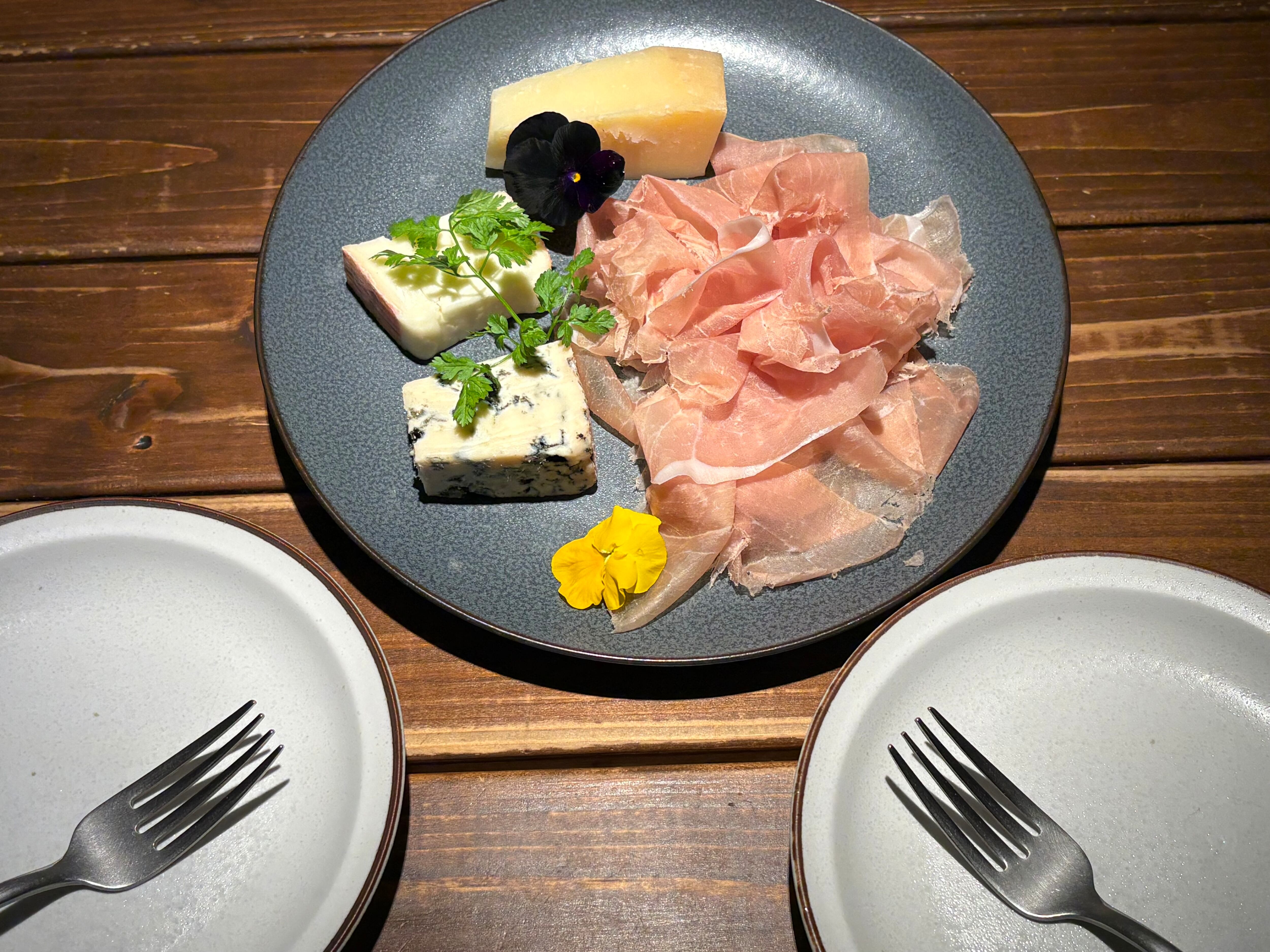 家飲み向け、カッティングボード付きのフランス産チーズ、生ハムのセット。